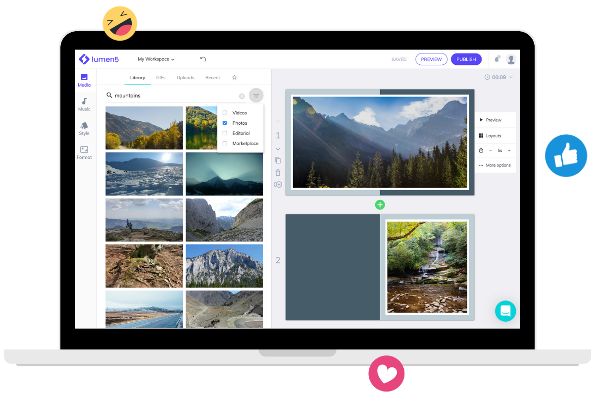 Lumen5 focuses on storytelling, allowing businesses and marketers to create explainer videos, ads, and promotional content easily.